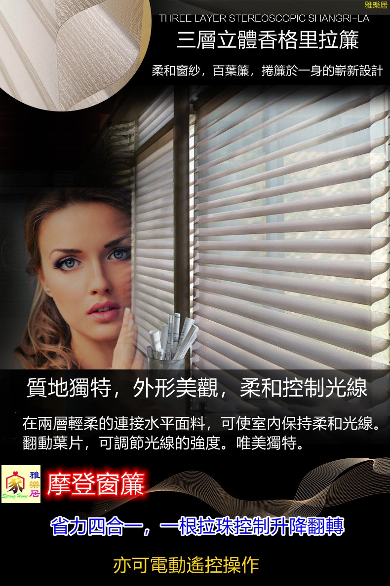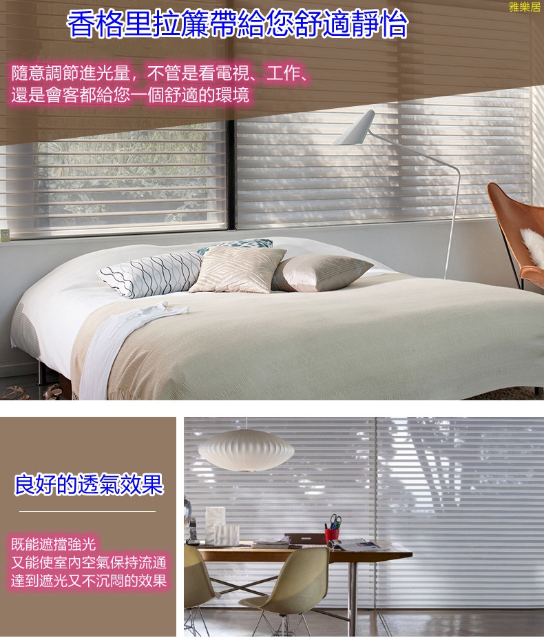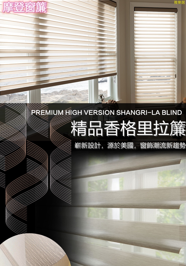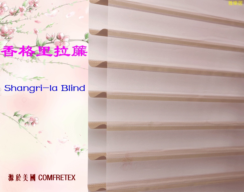 香格里拉簾Shangri-la Blind 源於美國COMFERTEX。是一種糅合了布簾、窗紗、百葉簾、捲簾於一身的嶄新設計窗簾。香格里拉簾是保持私隱及控制光線最佳選擇。廣泛用於家居、寫字樓咖啡廳、西餐廳、酒店、會所等場所。